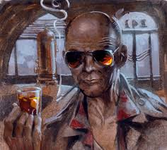 Hunter S. med tre av sina gängse attribut: solglasögonen, cigarettmunstycket och alkoholen. Det är bara en sak som fattas. På bilden alltså.